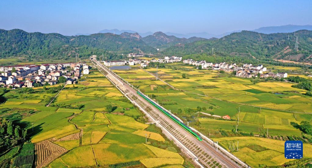 10月3日,列車(chē)從浙江省仙居縣豐收的稻田旁駛過(guò)(無(wú)人機照片)。