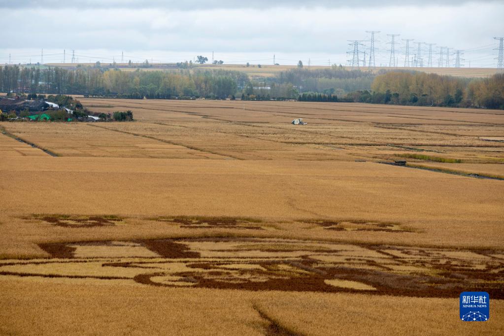 10月3日,收割機在北大荒集團閆家崗農場(chǎng)有限公司農業(yè)現代化示范區作業(yè)。
