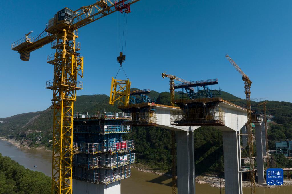 這是10月3日拍攝的重慶市北碚區渝武高速公路復線(xiàn)觀(guān)音峽嘉陵江特大橋項目施工現場(chǎng)(無(wú)人機照片)。