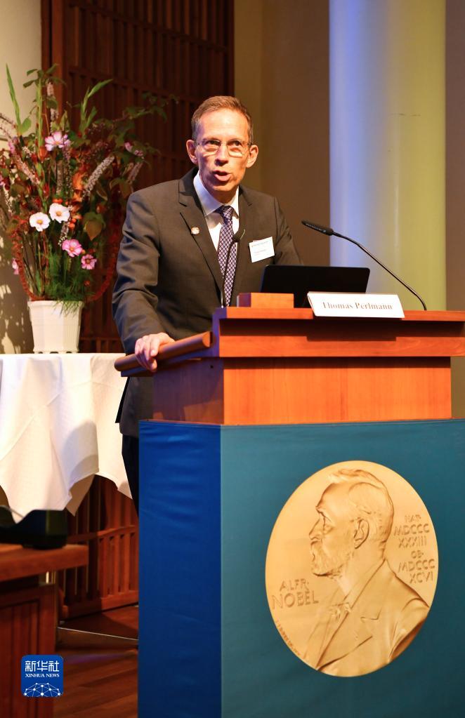 10月3日,在瑞典斯德哥爾摩卡羅琳醫學(xué)院舉行的2022年諾貝爾生理學(xué)或醫學(xué)獎公布現場(chǎng),評獎委員會(huì )秘書(shū)托馬斯·佩爾曼宣布獎項得主。