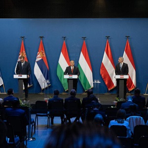 10月3日,在匈牙利首都布達佩斯,匈牙利總理歐爾班(中)、塞爾維亞總統武契奇(左)和奧地利總理內哈默出席聯(lián)合新聞發(fā)布會(huì )。