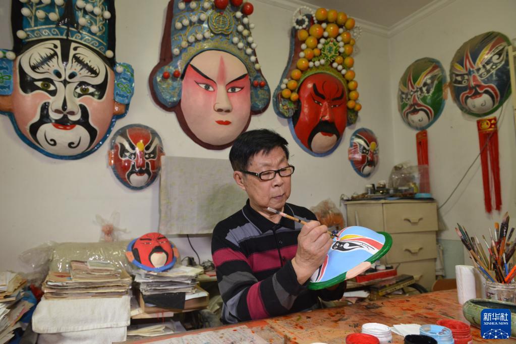 10月2日,85歲的張智在河北省石家莊市新華區家中制作臉譜。