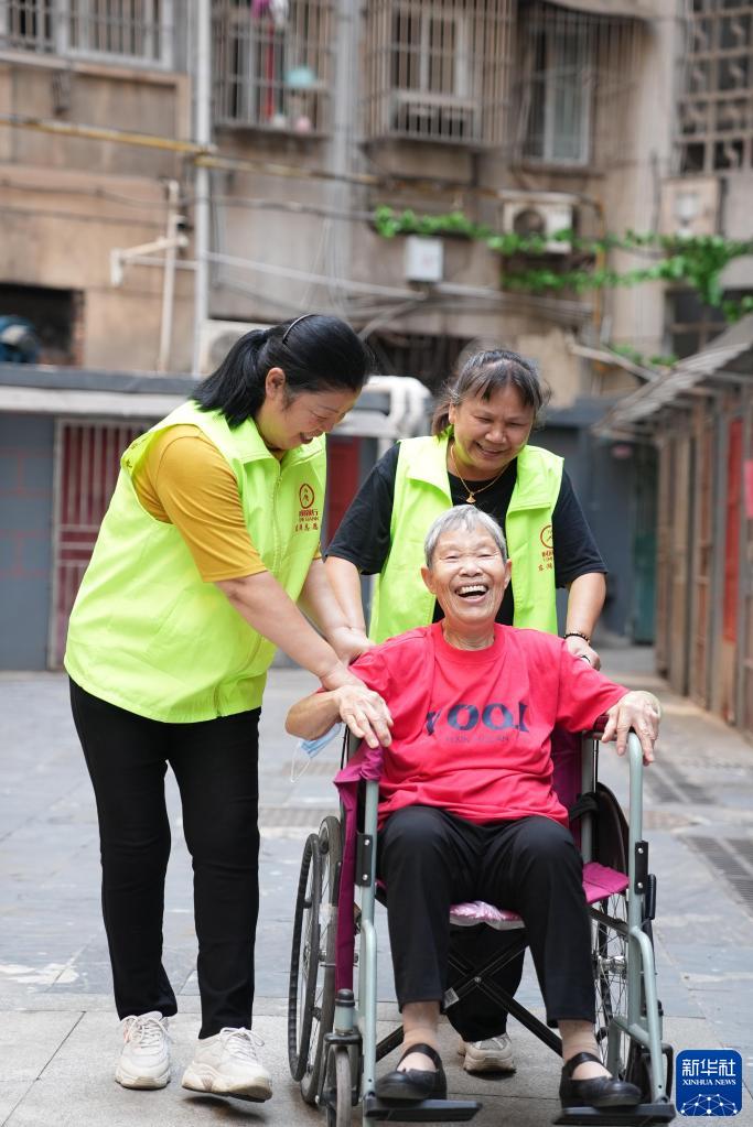 在南昌市東湖區火神廟社區,“時(shí)間銀行”志愿者推著(zhù)老人外出(9月29日攝)。