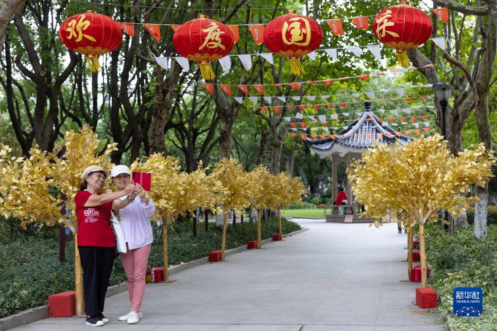 10月4日,老人在上海田園公園拍照留影。