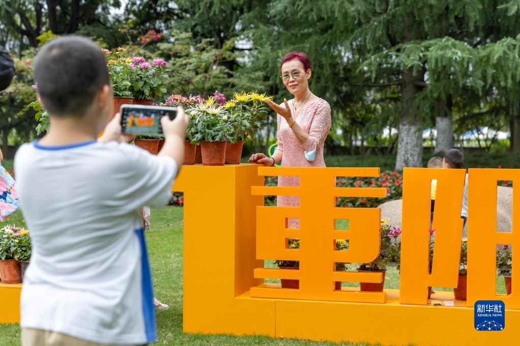10月4日,一名兒童為老人在上海田園公園“秋意籬下菊花黃”菊花展前拍照。