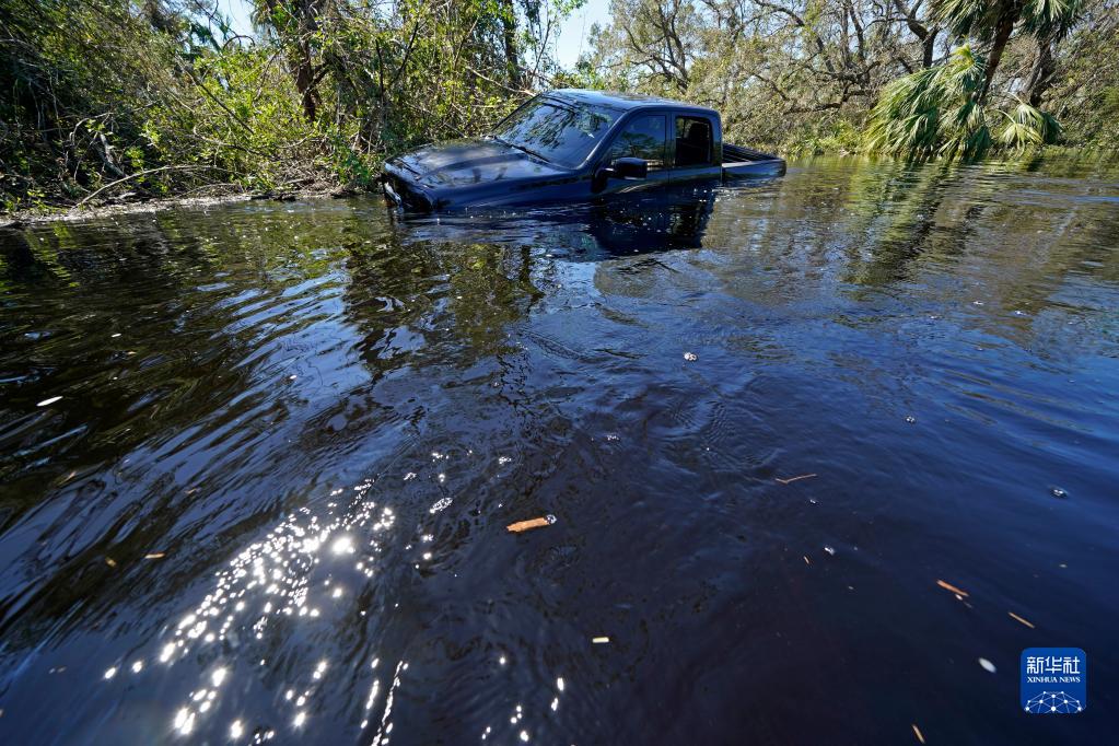 這是10月3日在美國佛羅里達州北港拍攝的淹在洪水中的車(chē)輛。