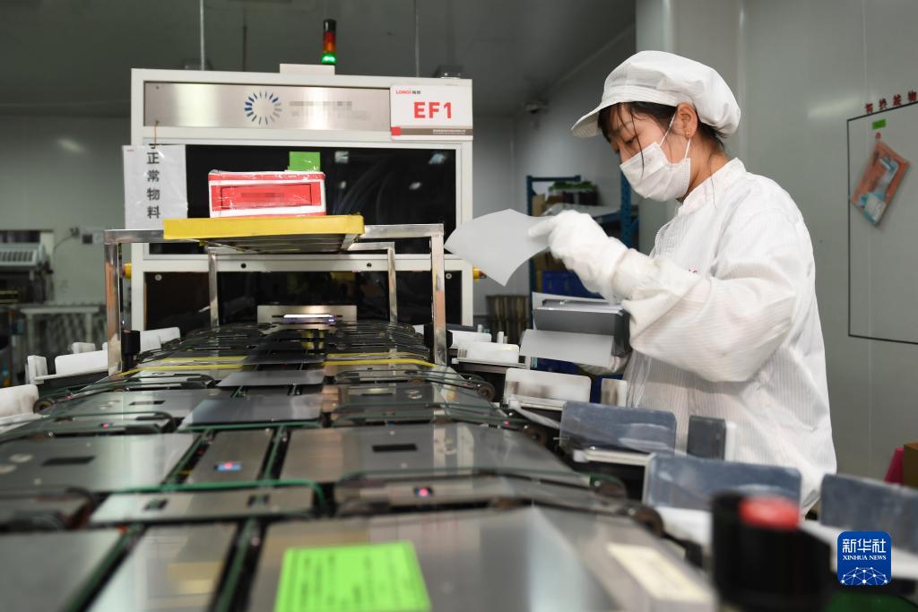 在隆基綠能科技股份有限公司西安切片工廠(chǎng),工人在進(jìn)行檢測包裝作業(yè)(2022年1月18日攝)。新華社記者 李一博 攝
