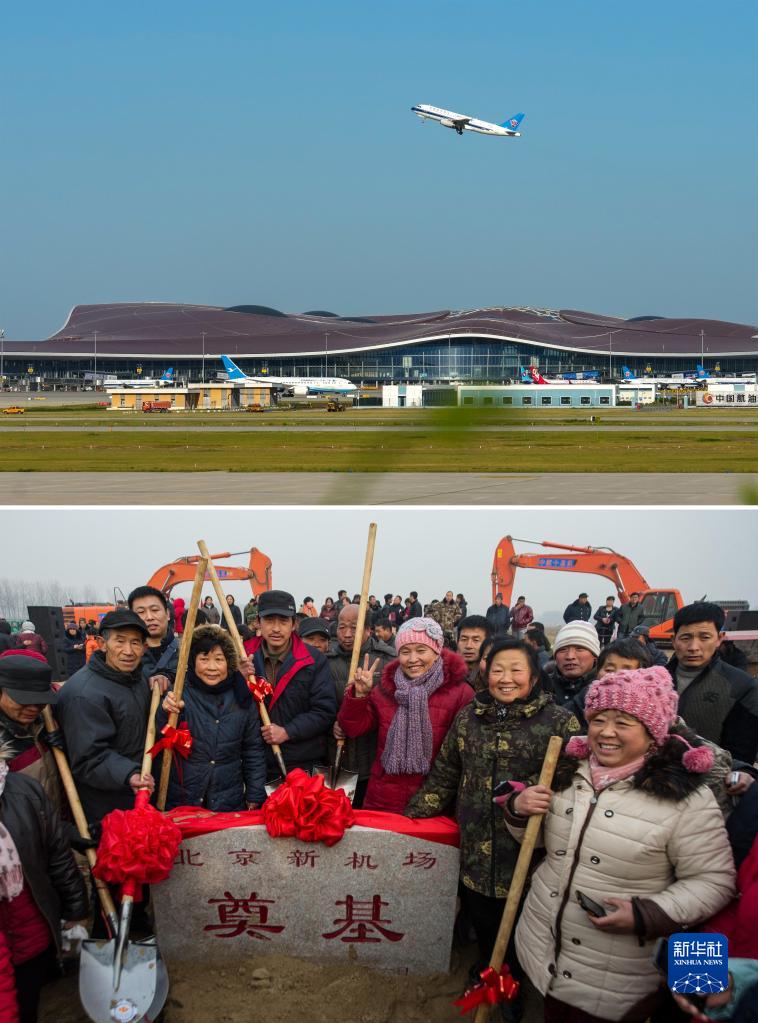 這是一張拼版照片:上圖為2022年9月7日,一架中國南方航空公司的飛機從北京大興國際機場(chǎng)起飛(新華社記者鞠煥宗攝);下圖為2014年12月26日,來(lái)自附近村莊的村民在北京新機場(chǎng)奠基石旁留念(資料照片,新華社記者羅曉光攝)。 新華社發(fā)