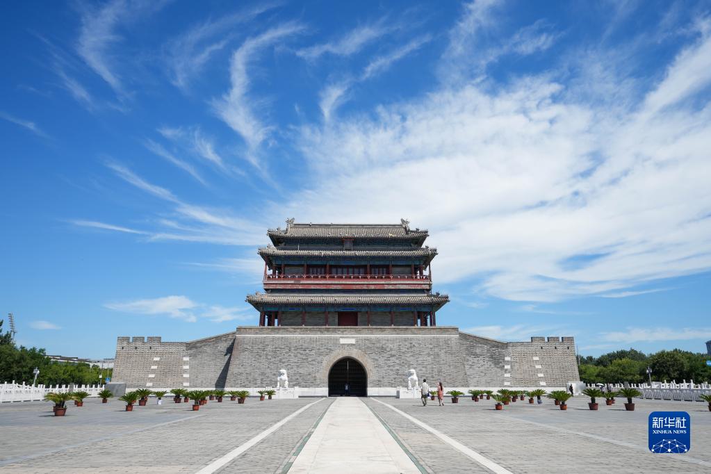 2022年8月16日,游客在位于北京中軸線(xiàn)上的永定門(mén)城樓前參觀(guān)游覽。 新華社記者 鞠煥宗 攝
