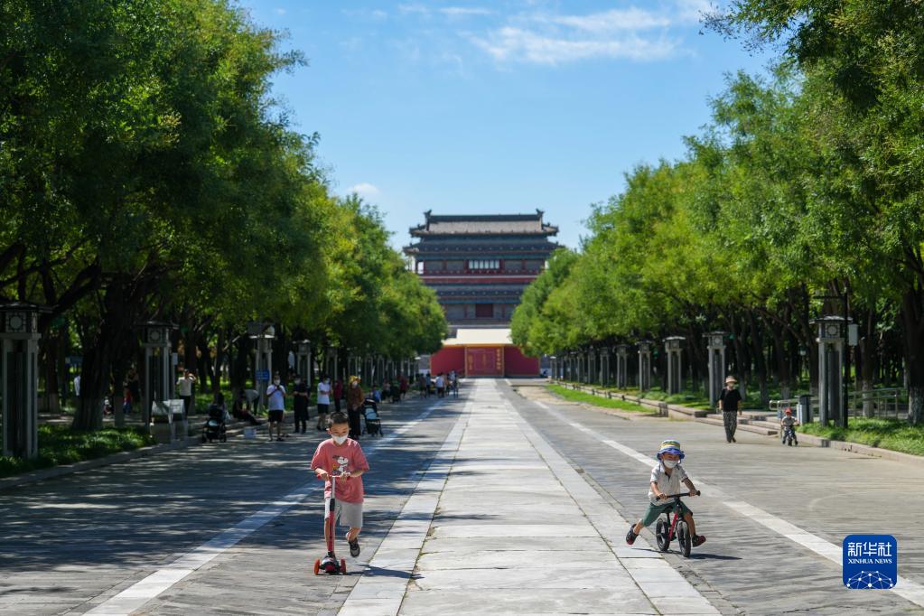 2022年8月16日,兩名小朋友在北京永定門(mén)公園的南中軸線(xiàn)御道景觀(guān)區內玩耍。 新華社記者 鞠煥宗 攝
