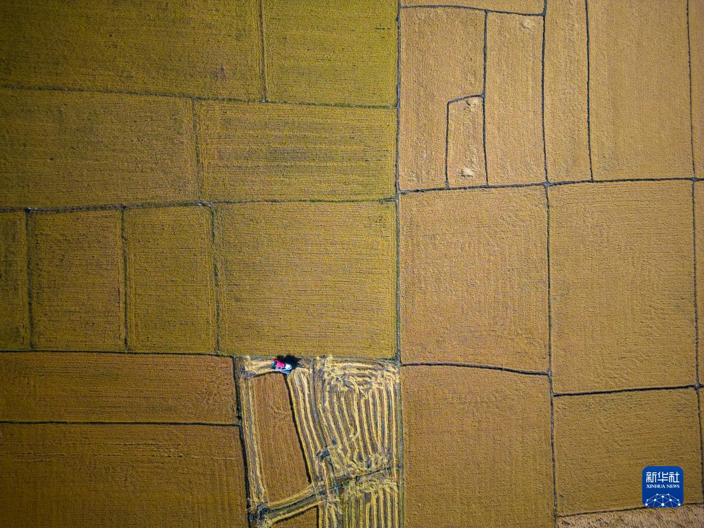 10月5日,在哈爾濱市道外區民主鎮,農民在稻田里忙碌(無(wú)人機照片)。