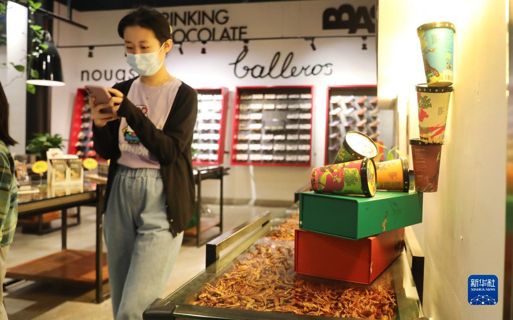 游客走在位于上海楊浦濱江的奧地利珍得巧克力劇院商店內(2022年9月24日攝)。