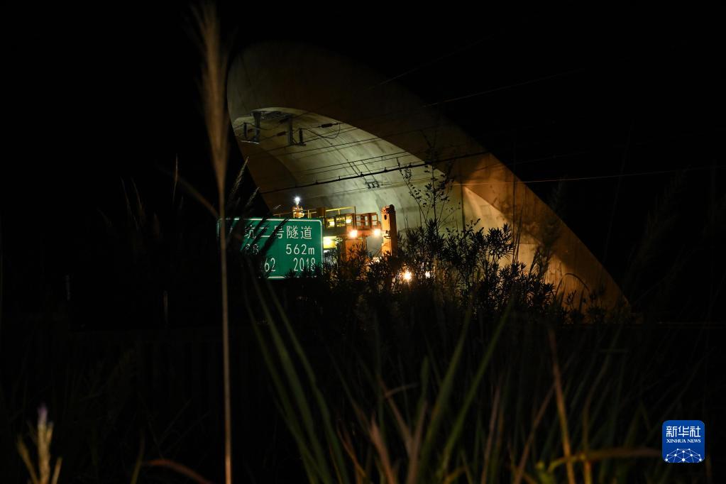10月5日凌晨,在安徽宣城杭黃高鐵績(jì)溪段,接觸網(wǎng)工在檢修接觸網(wǎng)設備。