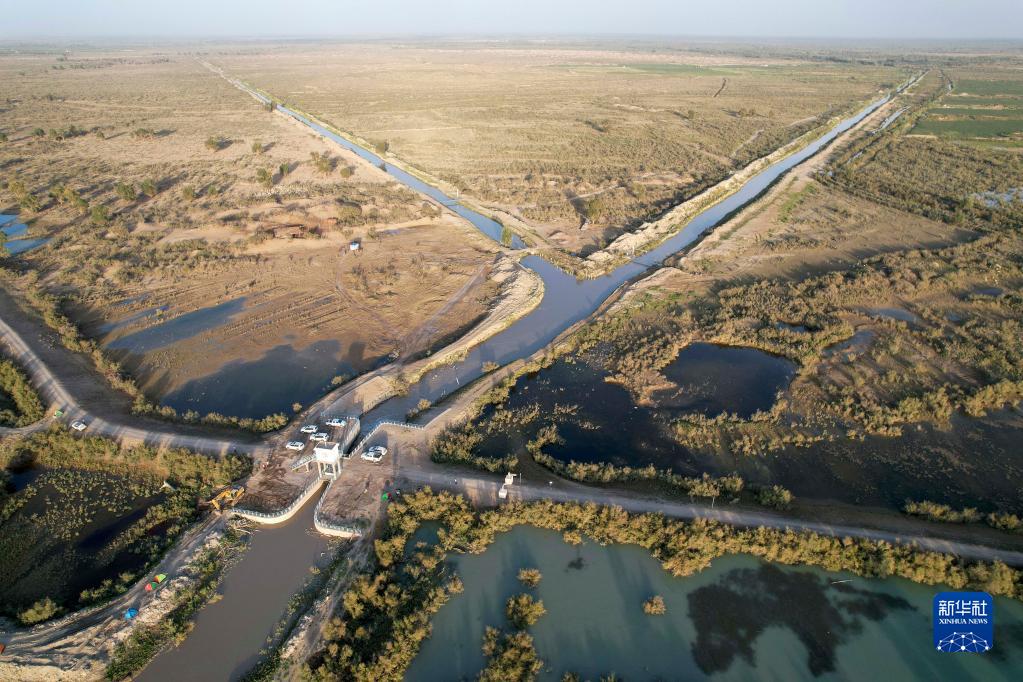 從塔里木河上游奔涌而來(lái)的洪水通過(guò)新疆阿克蘇地區沙雅縣沙德克確了生態(tài)閘,流向不同方向(2022年8月13日攝,無(wú)人機照片)。