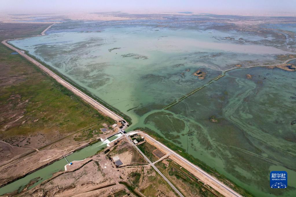 這是2022年8月20日拍攝的新疆尉犁縣境內大西海子水庫以及泄洪閘(無(wú)人機照片)。