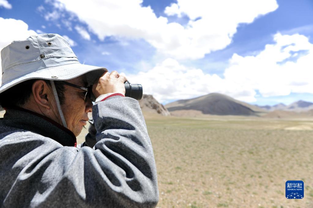 在羌塘國家級自然保護區,野保員用望遠鏡觀(guān)察野生動(dòng)物(2018年8月4日攝)。新華社記者 張汝鋒 攝