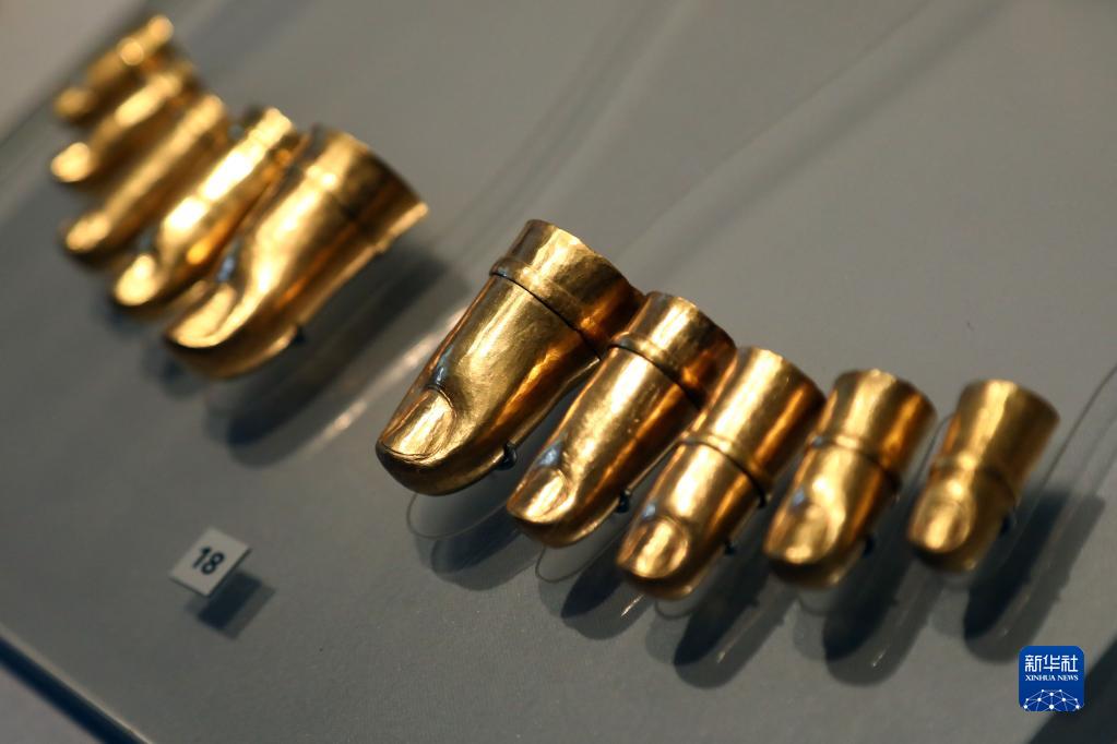這是10月3日在位于埃及開(kāi)羅的埃及博物館拍攝的金質(zhì)腳趾套。 新華社發(fā)(艾哈邁德·戈馬攝)