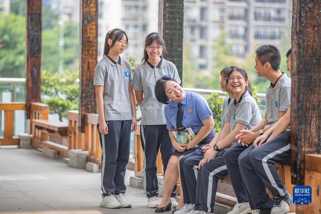 9月20日,在重慶市第三十七中學(xué),梅玫與學(xué)生在課間交流。