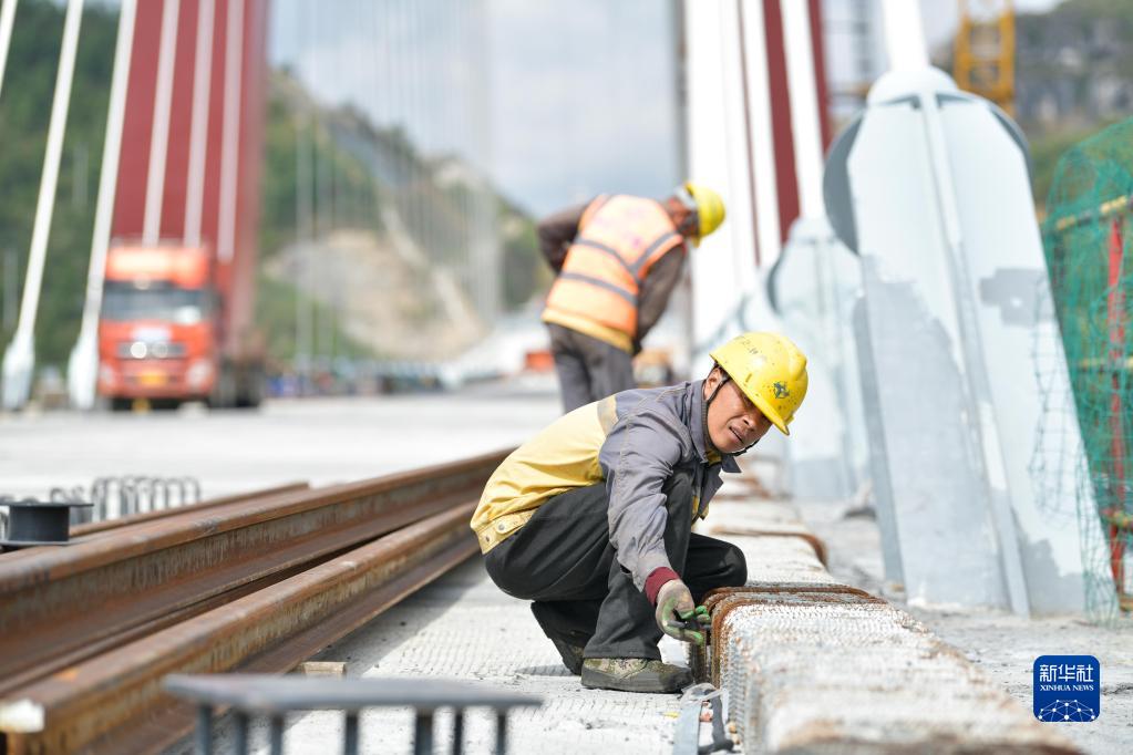 10月6日,中交二公局的工人在貴州龍里河大橋上對附屬工程施工。