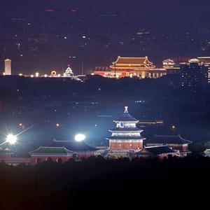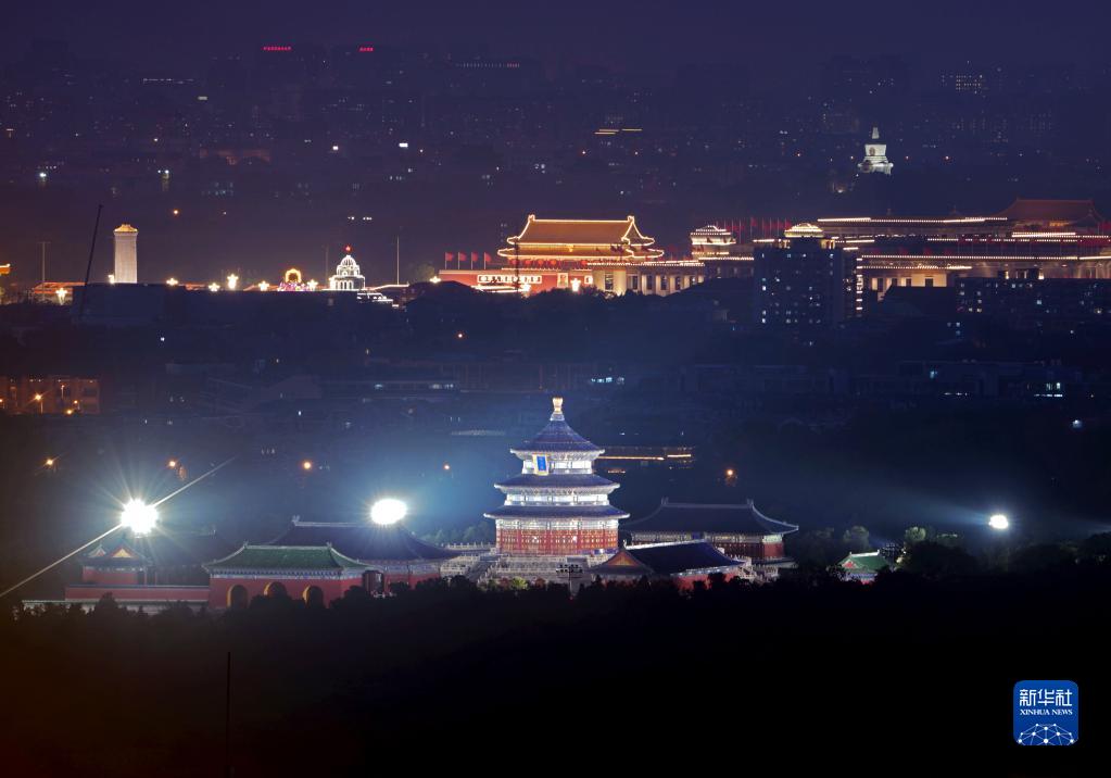 當日北京天氣晴好,夜色下,地標性建筑宏偉壯觀(guān)。