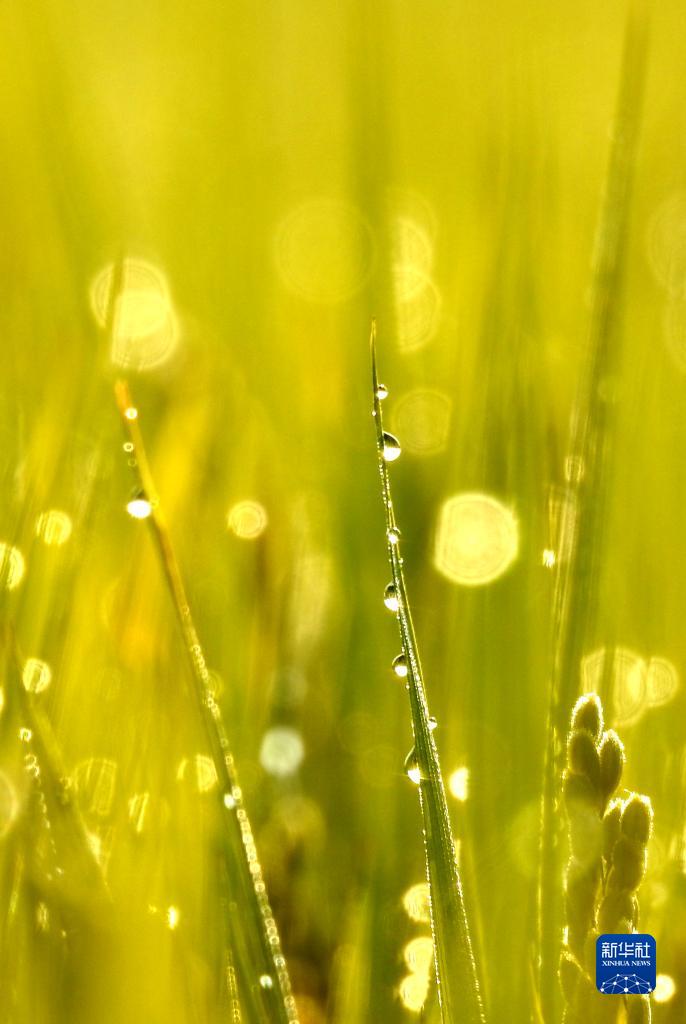 在江蘇連云港一處稻田里拍攝的露珠(9月29日攝)。