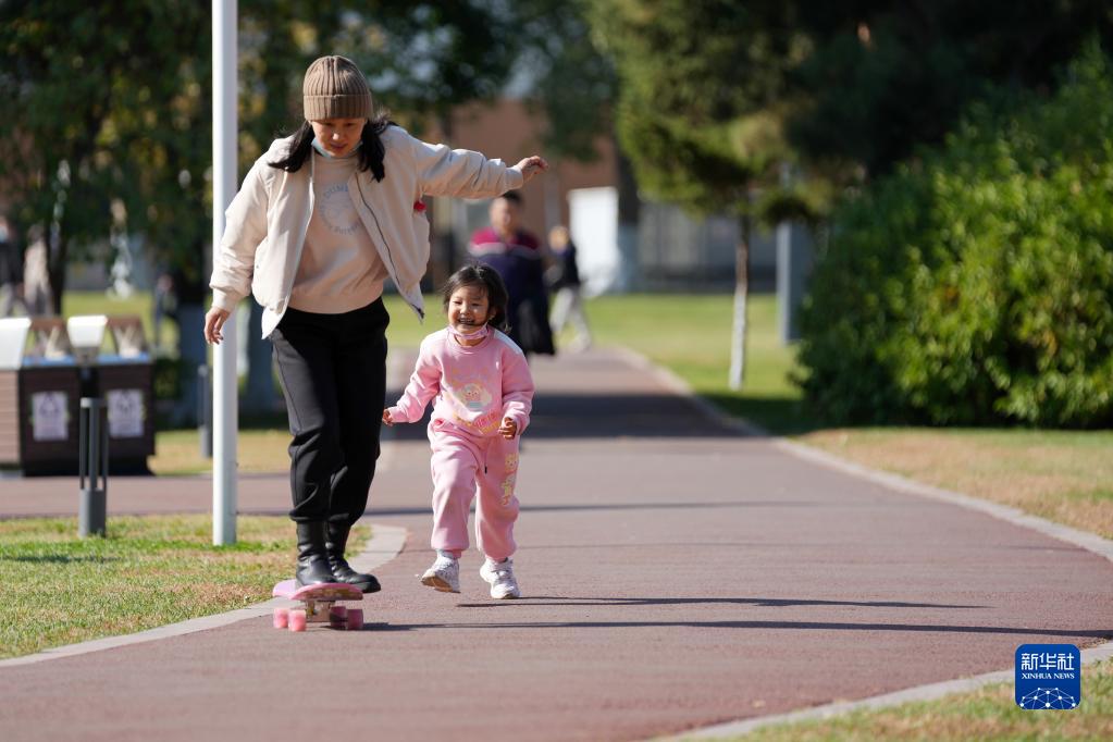 10月7日,在哈爾濱市湘江公園,家長(cháng)帶著(zhù)孩子玩滑板。