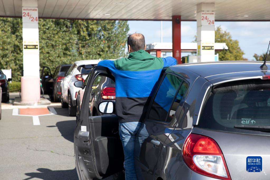 10月6日,在法國北部城市里爾,歐尚超市的加油站前車(chē)輛排起長(cháng)隊。近日,法國道達爾集團旗下的許多加油站因燃油供應中斷而暫時(shí)關(guān)閉,導致其他加油站前排起長(cháng)龍。