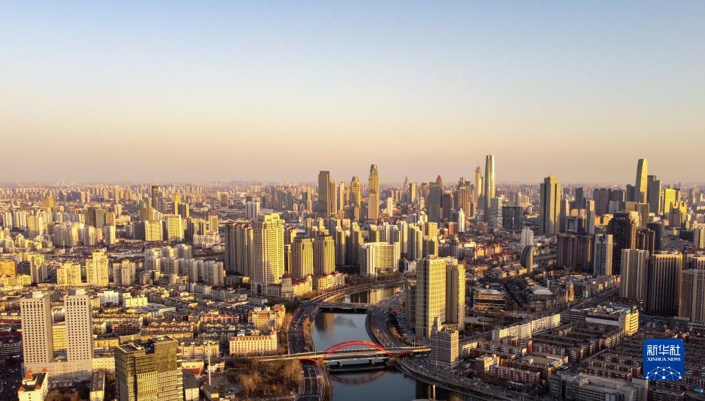 2022年3月27日黃昏時(shí)段拍攝的天津市中心城區海河一景(無(wú)人機照片)。