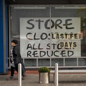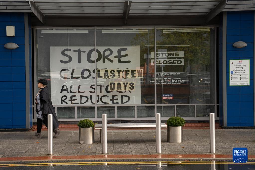 10月7日,在英國曼徹斯特,一名行人走過(guò)一家關(guān)閉的店鋪。