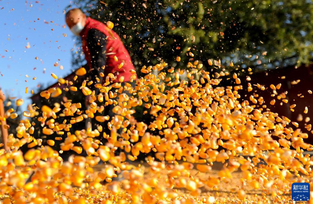 新疆塔城市也門(mén)勒鄉闊克加依達克村村民搶抓有利天氣晾曬玉米(10月5日攝)。