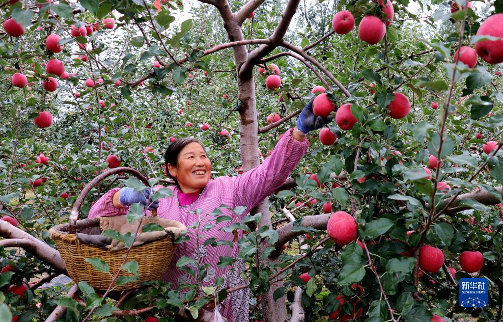10月8日,在甘肅省平?jīng)鍪徐o寧縣威戎鎮楊灣村,果農在采摘蘋(píng)果。新華社發(fā)(王毅 攝)