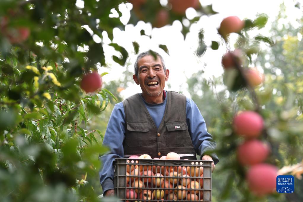 10月8日,農民在河北省張家口市懷來(lái)縣東八里鄉上八里村蘋(píng)果園里搬運蘋(píng)果。新華社發(fā)(孫慧軍 攝)