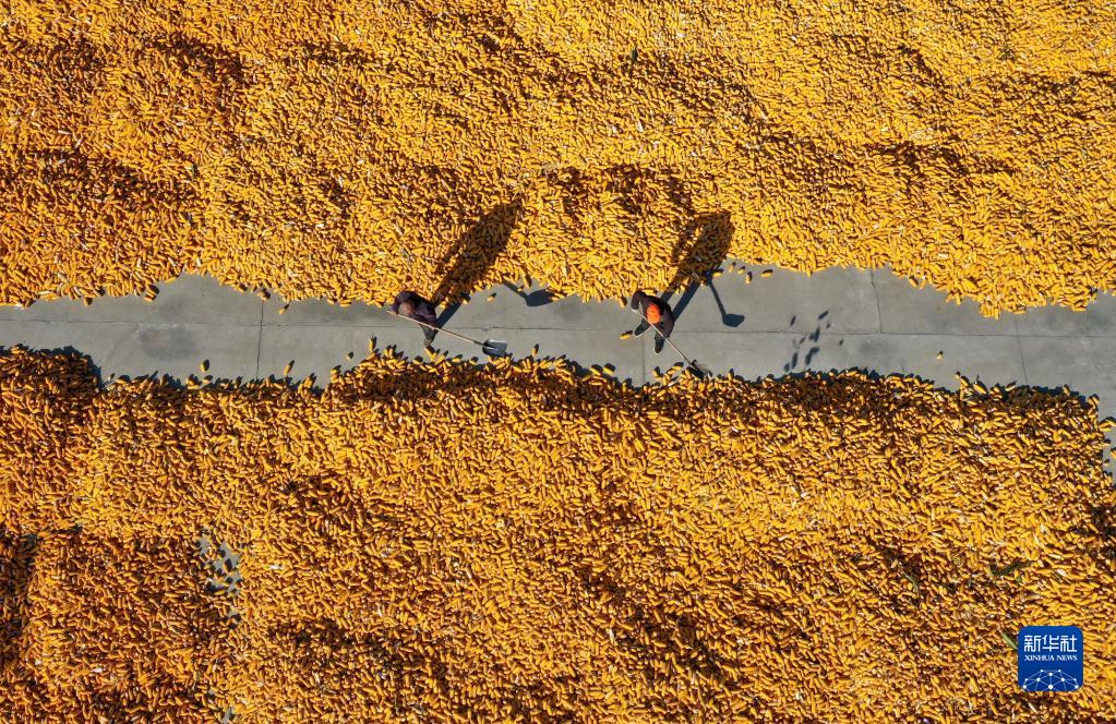 10月9日,在河北省石家莊晉州市周家莊鄉第七生產(chǎn)隊,農民在晾曬收獲的玉米(無(wú)人機照片)。