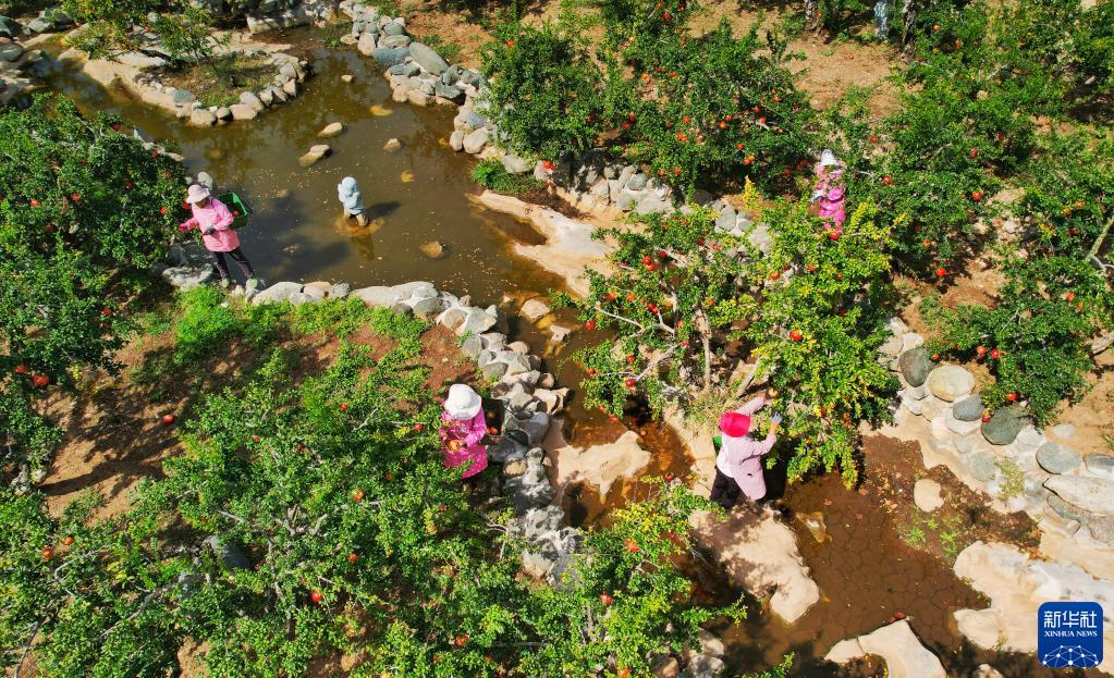 10月9日,嶧城區榴園鎮萬(wàn)畝石榴園工人在采摘石榴(無(wú)人機照片)。