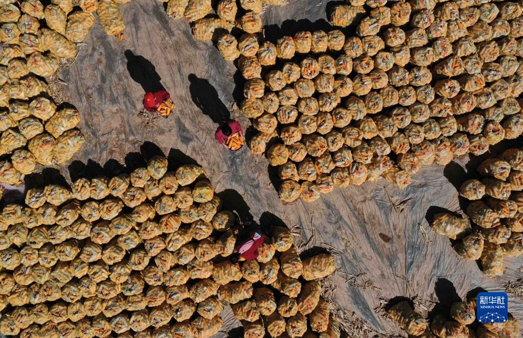 10月9日,河北省邢臺市南和區賈宋鎮郄村村民在晾曬玉米(無(wú)人機照片)。
