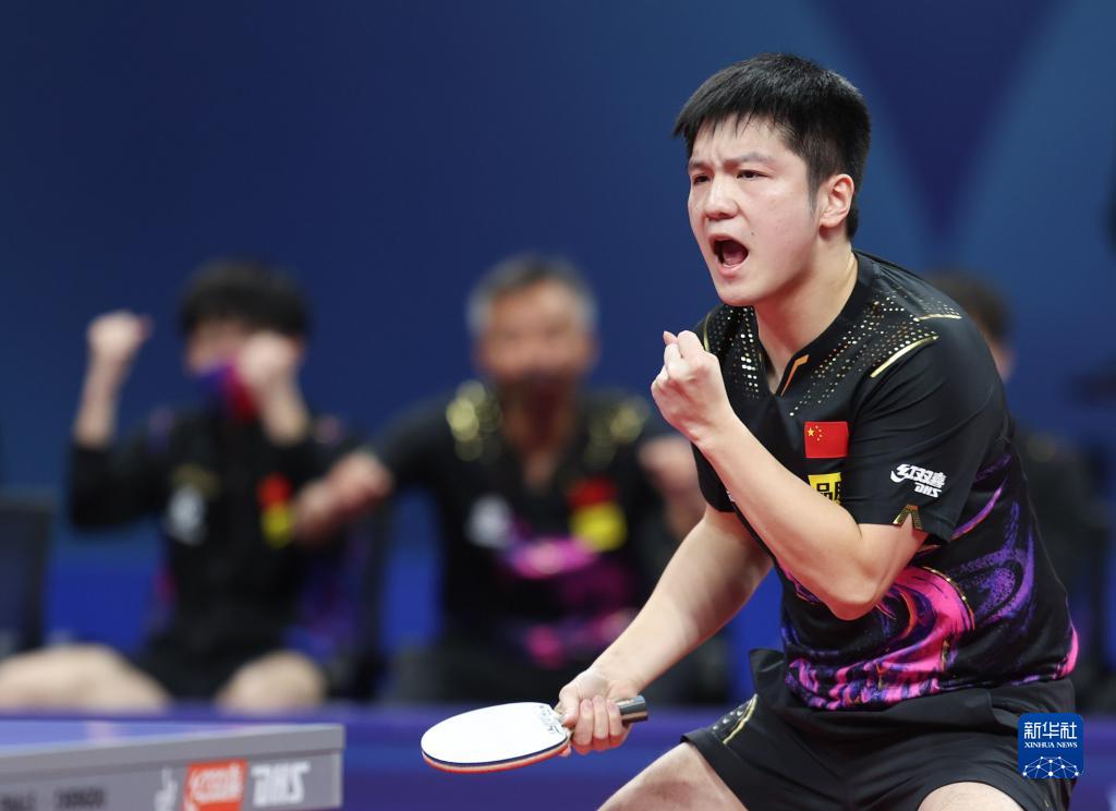 10月9日,中國隊選手樊振東在比賽中慶祝得分,他以3比0戰勝德國隊選手貝內迪克特·杜達。新華社記者 江宏景 攝