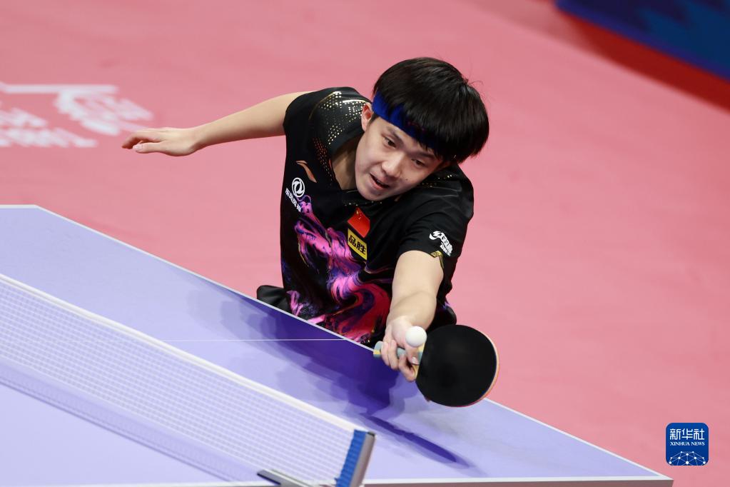 10月9日,中國隊選手王楚欽在比賽中回球,他以3比0戰勝德國隊選手凱·斯達姆珀。新華社記者 胥冰潔 攝