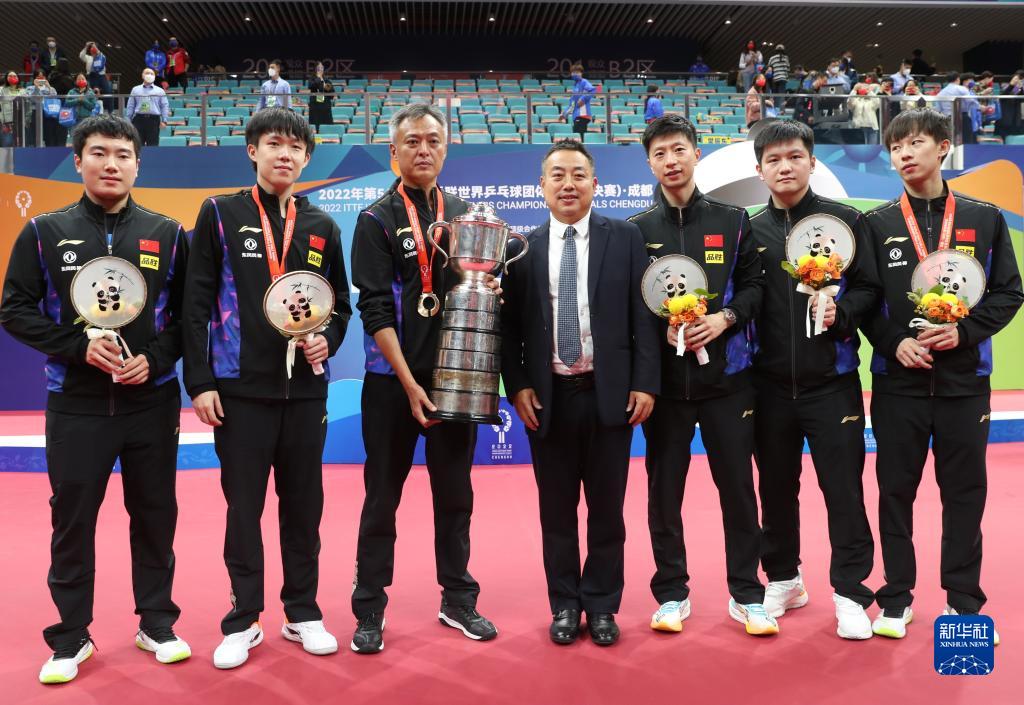 10月9日,中國隊選手林高遠、樊振東、馬龍、中國乒協(xié)主席劉國梁、教練員秦志戩以及選手王楚欽、梁靖崑(從右至左)在頒獎儀式上與斯韋思林杯合影留念。新華社記者 江宏景 攝