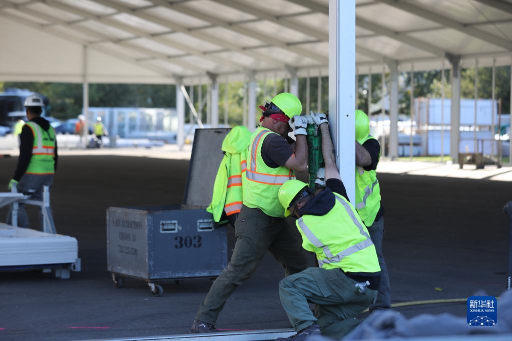 10月9日,工人在位于美國紐約市蘭德?tīng)枍u的移民救援中心建設工地工作。