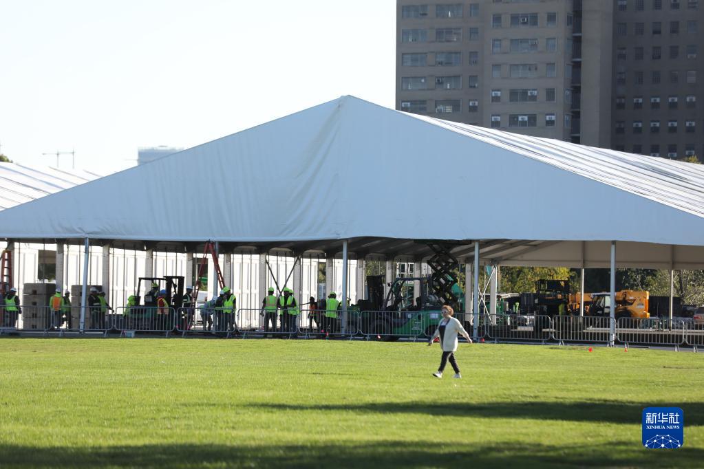 10月9日,工人在位于美國紐約市蘭德?tīng)枍u的移民救援中心建設工地工作。