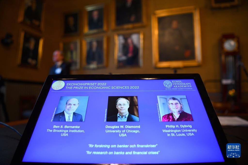 10月10日,在瑞典斯德哥爾摩舉行的2022年諾貝爾經(jīng)濟學(xué)獎公布現場(chǎng),屏幕顯示獎項得主本·伯南克(左)、道格拉斯·戴蒙德(中)和菲利普·迪布維格的照片。
