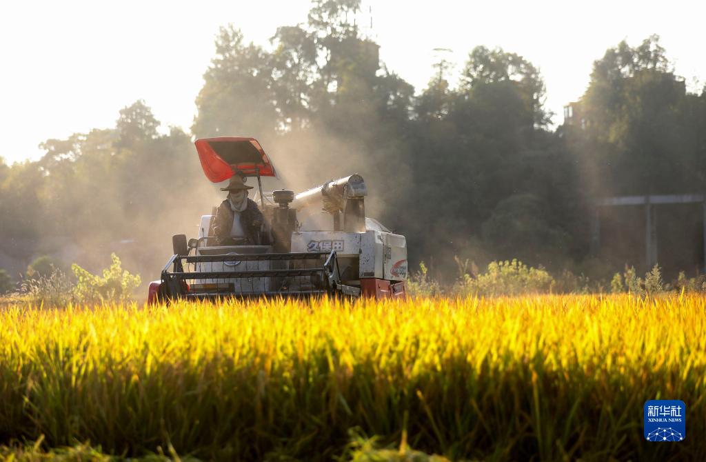 10月10日,在湖南省資興市唐洞街道星塘村,村民駕駛收割機搶收水稻。