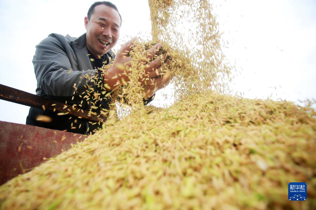 10月9日,在江蘇省儀征市陳集鎮友好村,農民在收獲水稻。