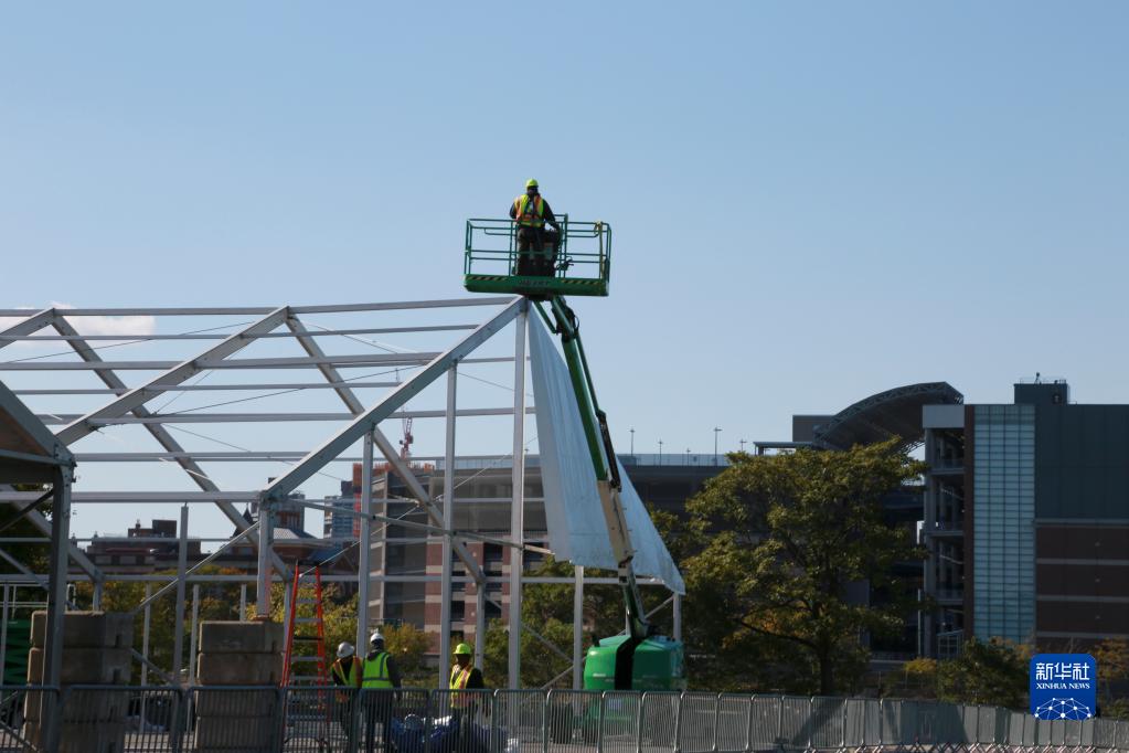 10月9日,工人在位于美國紐約市蘭德?tīng)枍u的移民救援中心建設工地工作。