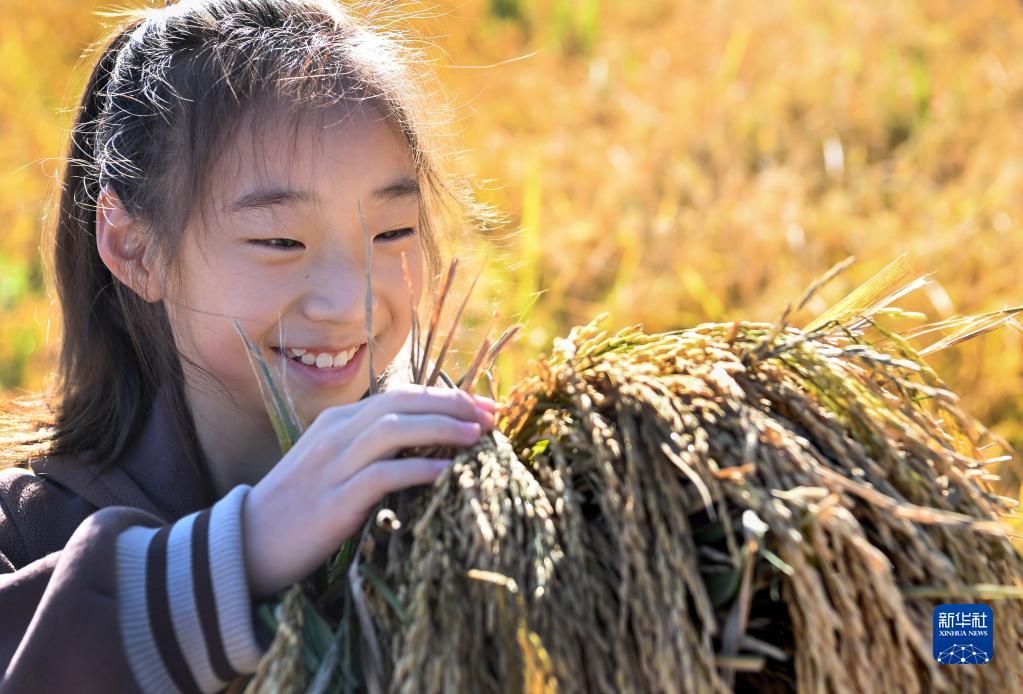 10月11日,一位小朋友在觀(guān)察豐收的稻穗。