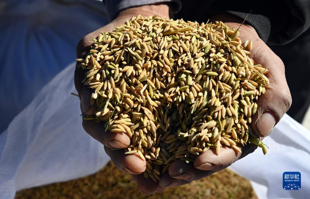 10月11日,農民在水稻開(kāi)鐮儀式上展示收獲的稻谷。