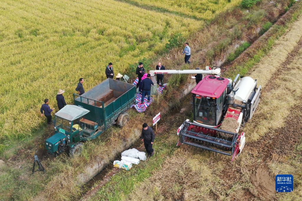 10月11日,工作人員在測產(chǎn)驗收現場(chǎng)將收割的稻谷裝袋(無(wú)人機照片)。