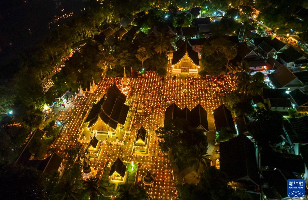10月11日晚,人們在老撾瑯勃拉邦古城點(diǎn)亮花燈(無(wú)人機照片)。