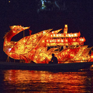 當日,瑯勃拉邦慶祝燈船節。人們用花燈點(diǎn)綴城市,在湄公河上放龍舟燈船,寄托美好的祝福。