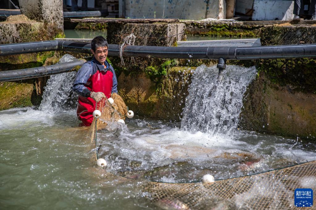 10月11日,在重慶市城口縣蓼子鄉明安村冷水魚(yú)產(chǎn)業(yè)基地,工作人員在捕撈準備出售的虹鱒魚(yú)。